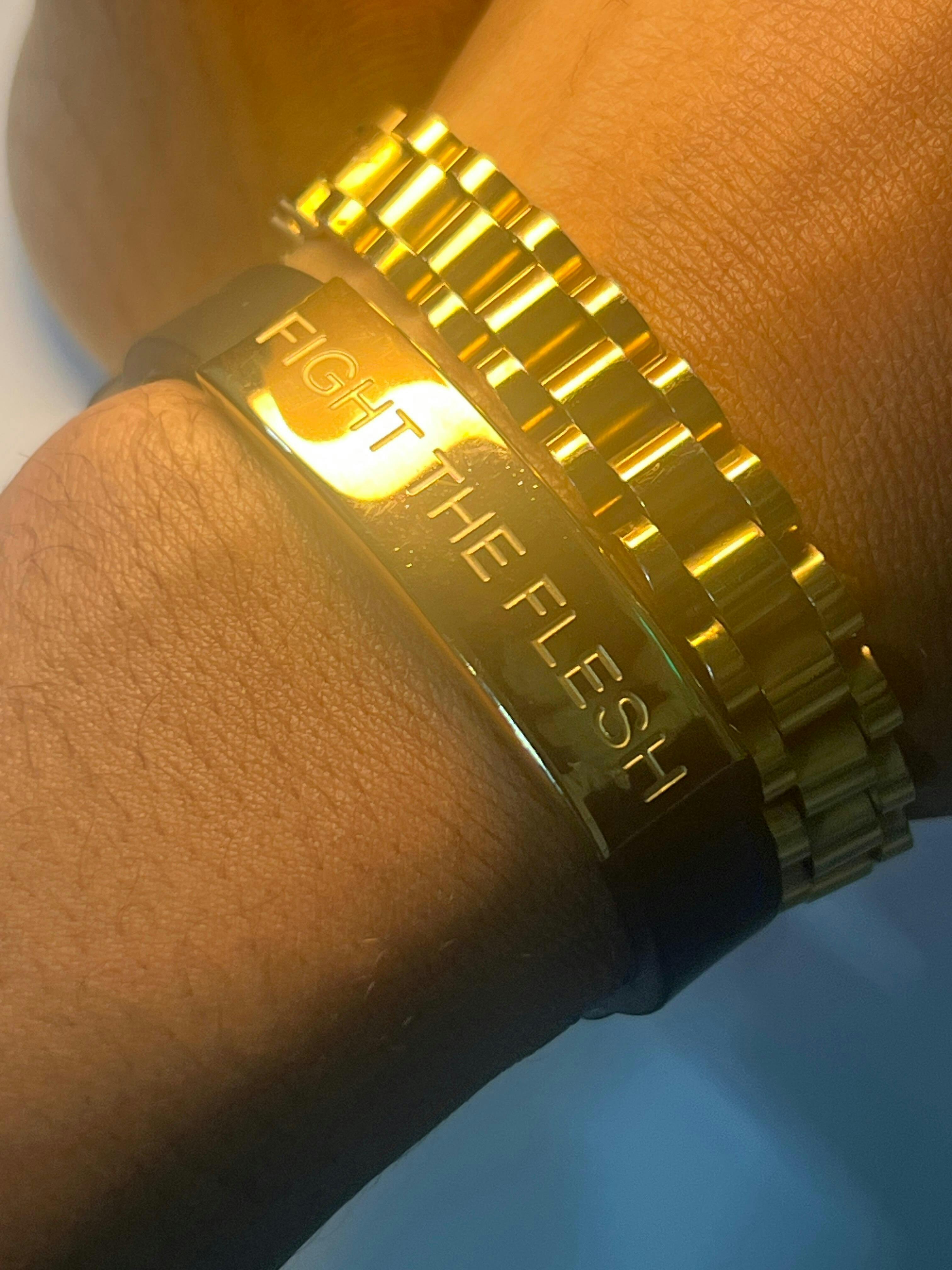 I love the bracelet! Whoever thought of it is a genius. I wish the silver buckle was gold like Fight The Flesh piece, but its not a big deal. This bracelet is a physical reminder that we are fighting a spiritual war against our flesh and to deny ourselves and follow Jesus Chrust. Thank you so much!